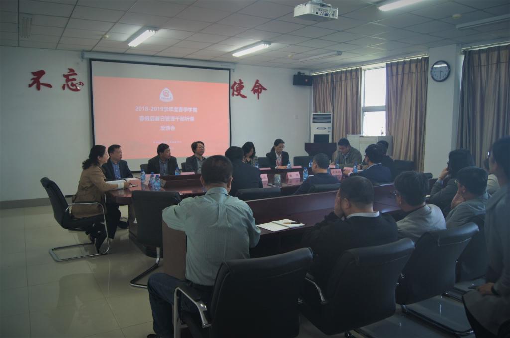 5月6日基础医学院2018-2019学年度春季学期春假后首日听课反馈会在基础医学院C座五楼大会议室举行。管理干部听课代表欧凤荣等九名校各部处领导干部,以及学院曹流院长、田江宜书记、李庆昌副书记、各教研室主任、副主任、教学秘书、教师代表及学院机关全体人员参加了本次会议。会议由李庆昌副书记主持。