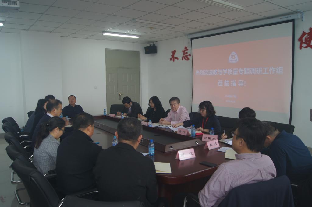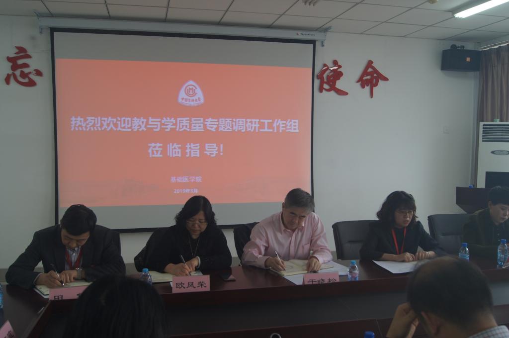 2019年3月20日基础医学院“教与学”质量工作调研会在学院C座五楼大会议室举行。于晓松副校长、教学质量监控与评估处唐漫处长、教务处欧凤荣处长、招生就业处田伟处长、学生处孙田杰处长、教师教学发展中心曲波主任,以及学院曹流院长、田江宜书记、李庆昌副书记、各教研室主任、教学秘书、教师代表及学院学生工作办公室、人才培养与学科科研管理办公室工作人员参加本次会议。会议由唐漫处长主持。