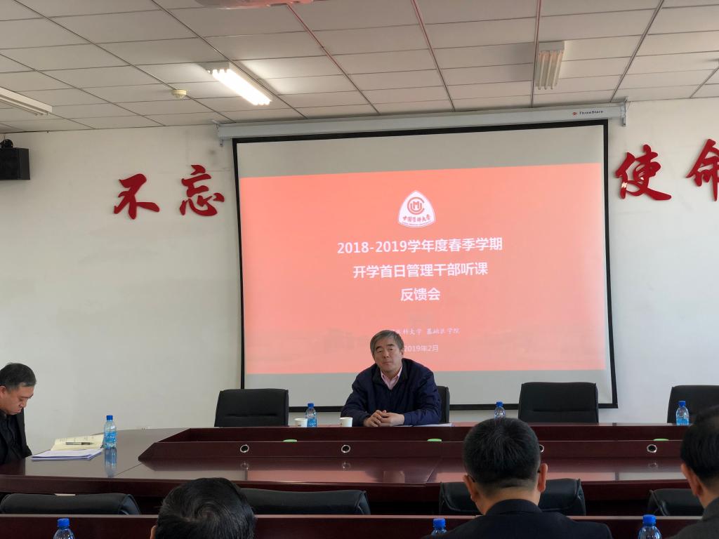 会上,学院领导对第一堂课的教学情况首先进行了反馈,开学首日教师展现了良好的教学风貌,基本功扎实、备课充分,学生出勤好,听课认真,玩手机现象明显减少。存在问题方面,曹流院长指出部分教师使用的课件陈旧、需要及时修改调整;田江宜书记指出课堂活跃度需要再提高,对日常教学质量的监督也要加强;李庆昌副书记指出教师要注重课件细节制作、注重课堂互动。其他管理干部听课代表也从教师授课、学生听课、教学环境等方面对存在的问题提出意见和建议。