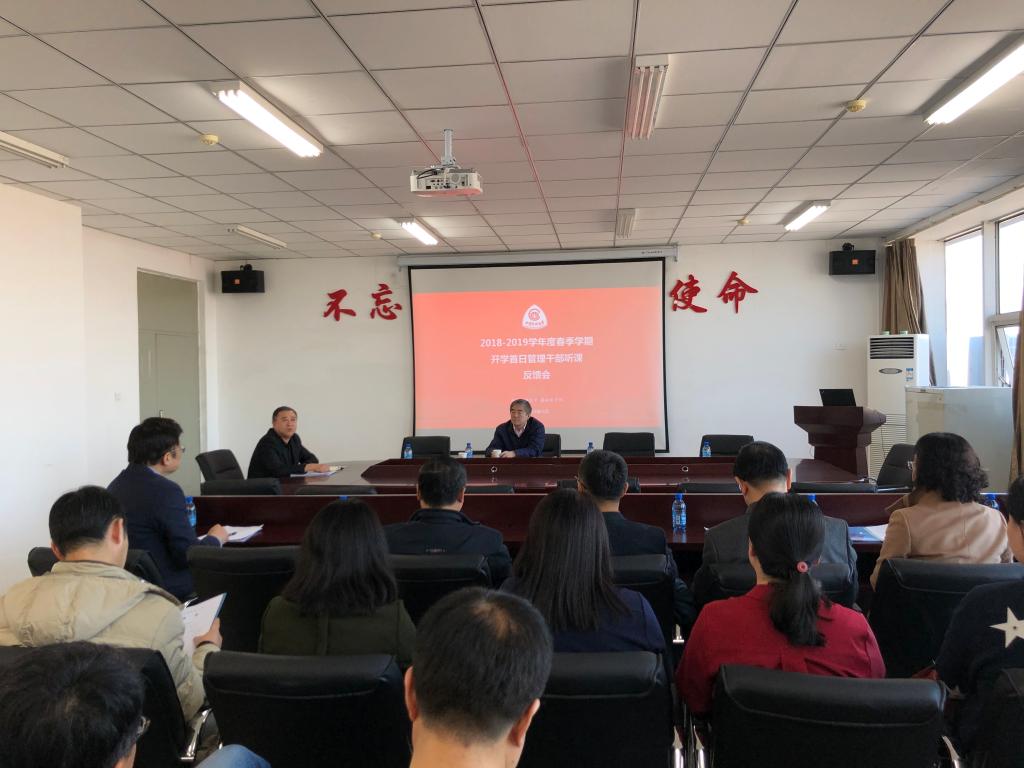 2月25日基础医学院2018-2019学年度春季学期开学首日听课反馈会在基础医学院C座五楼大会议室举行。于晓松副校长、管理干部听课代表田伟、李冲、刘强、计晓月、唐漫、许东阳、陈再兴、张阳,以及学院曹流院长、田江宜书记、李庆昌副书记、各教研室主任、教学秘书、教师代表及学院机关全体人员参加本次了会议。会议由李庆昌副书记主持。