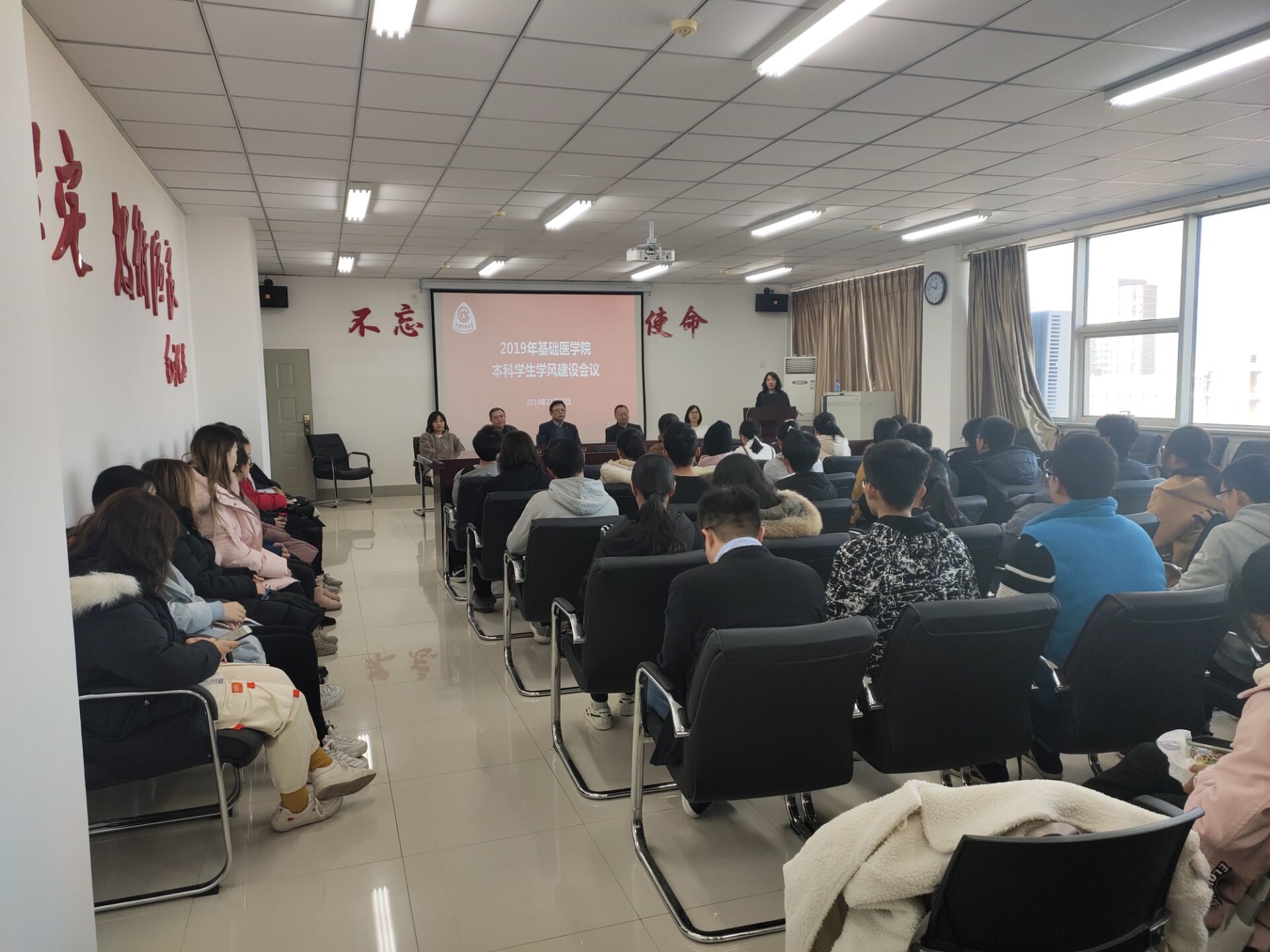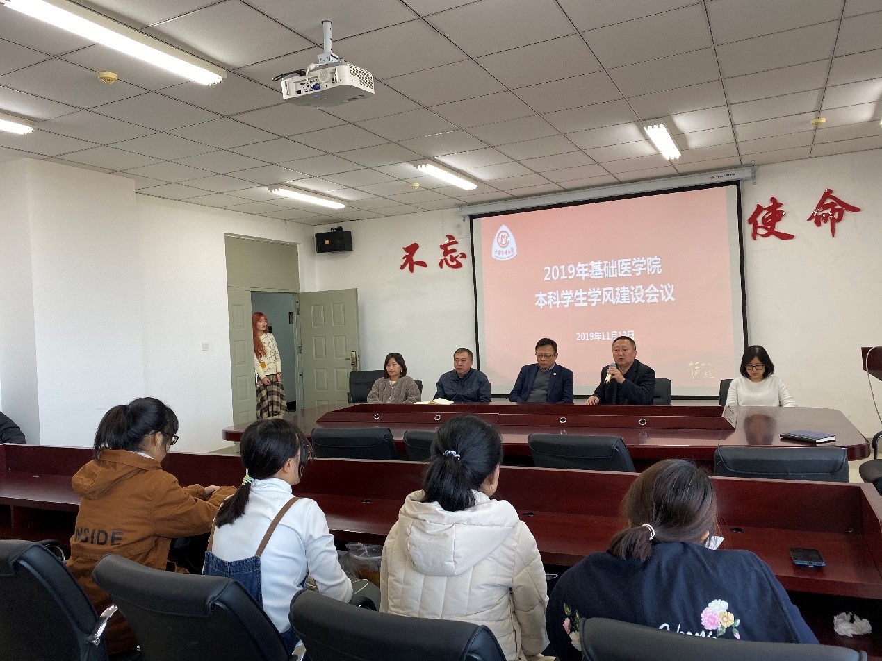 11月13日中午,基础医学院在C座5楼大会议室召开2019年基础医学院本科学生学风建设会议,基础医学院党政领导田江宜书记、曹流院长、李庆昌副书记、兼职班主任以及基础医学专业全体学生出席会议,会议由学工部主任杨晶主持。