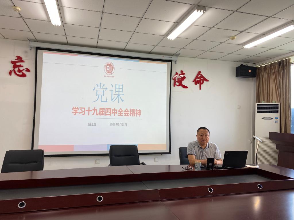 学院党委于2020年5月28日组织全院党员进行党课学习。由于处于疫情防控特殊时期,此次党课学习采取视频学习形式,机关全体党员在五楼会议室主会场参加现场学习。学院党委书记田江宜以学习十九届四中全会精神为主题,联系实际进行了精彩生动的讲解,使全体党员进一步加深了对十九届四中全会精神的理解,激励广大教师党员以更饱满的热情投入教学科研工作中。