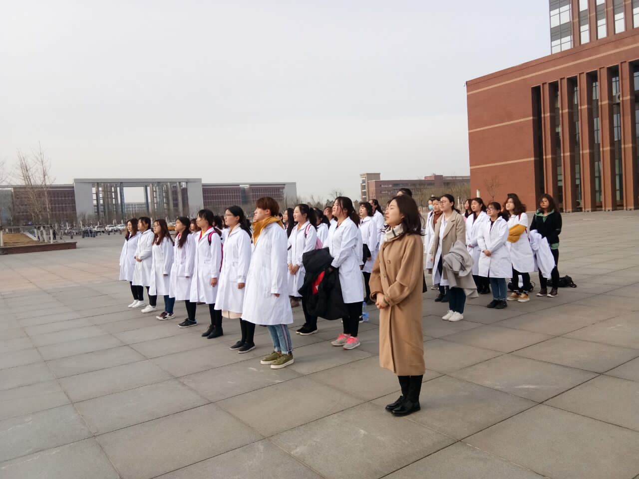 升旗仪式第二项:升校旗,奏唱校歌。作为医学生的我们时刻谨记政治坚定的道德准线,技术优良的职业本分,不负父母的期盼,不负性命的依托。
