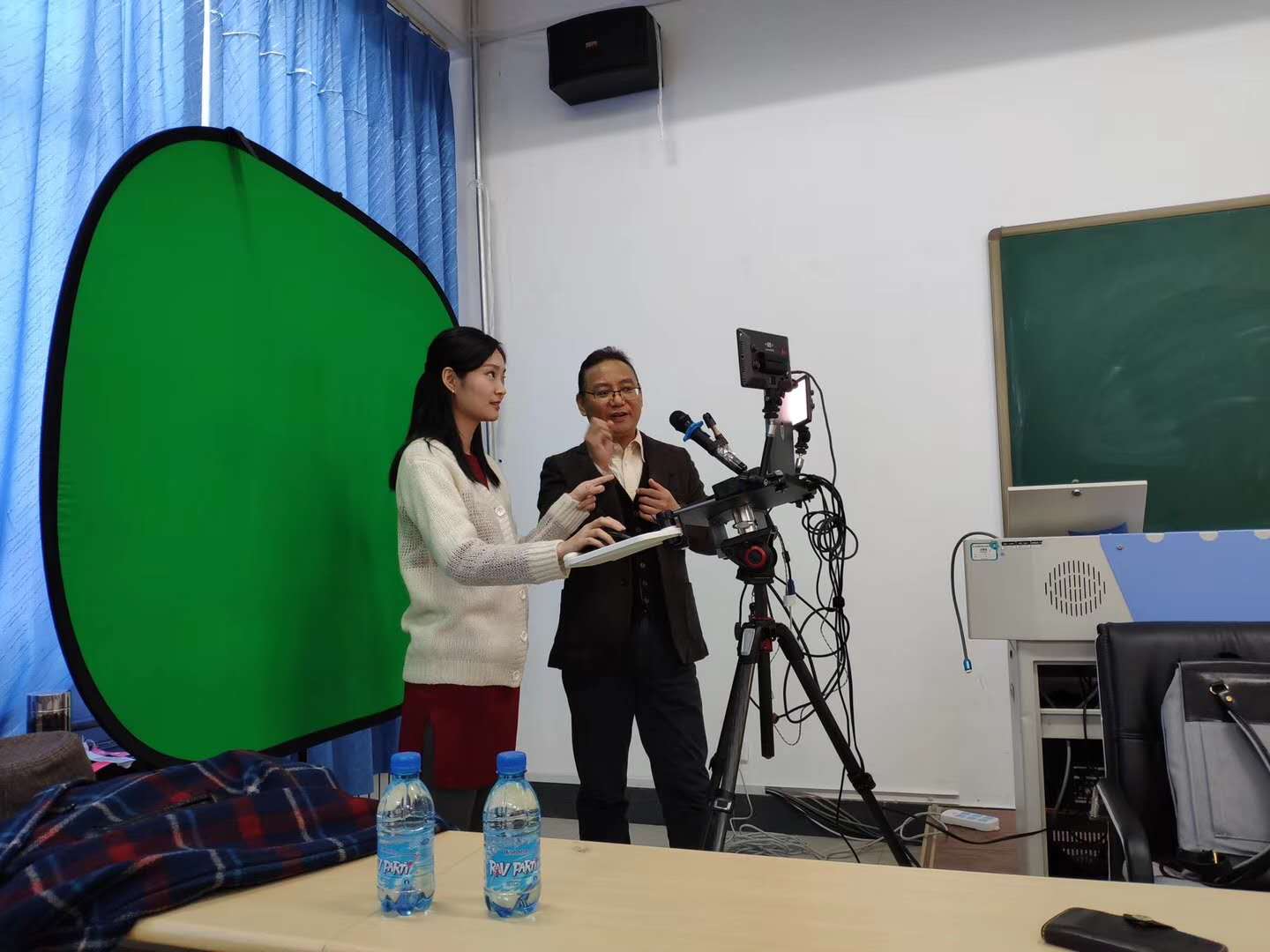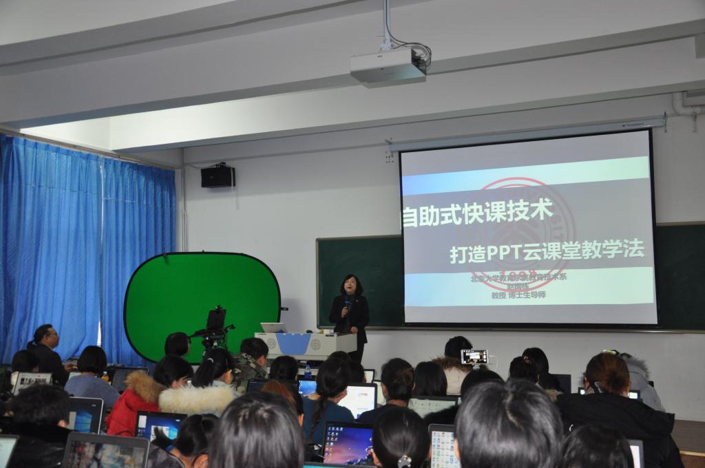 1月13日,赵教授对首日内容进行简单的梳理和回顾后演示了视频讲授微课录制、编辑和网络发布的流程,具体内容有两分镜头式(教师+幻灯片)、镜头重叠式(教师在前+幻灯片在后)、镜头切换式(教师、幻灯片或两者按需切换)、交互提问式(视频讲课+选择题)和组合环节式(手绘片头+动漫助教+视频讲授+在线提问)等方法的流程和网络发布。讲解演示完成后,赵教授组织参加培训教师进行现场实操演练,对教师进行现场指导教学。