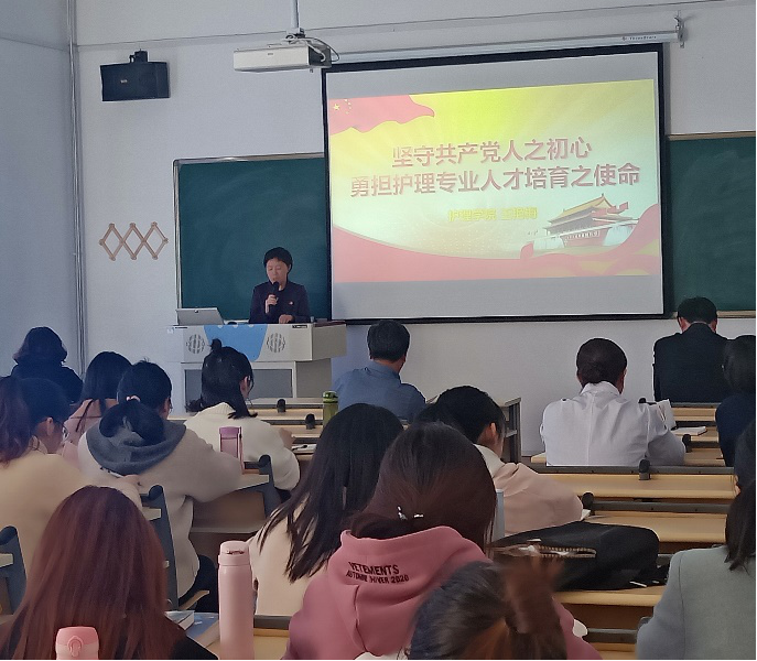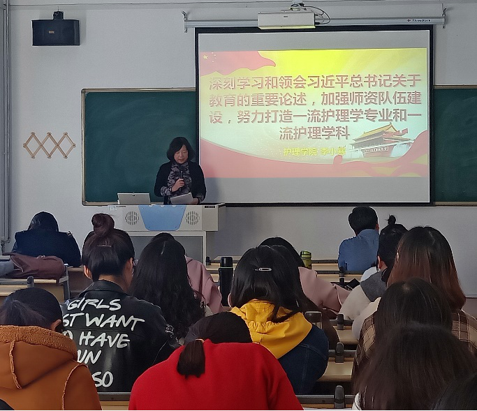 11月1日下午,护理学院党总支书记王艳梅同志和院长李小寒同志在护理学院第四教室分别以“坚守共产党人之初心,勇担护理专业人才培育之使命”和“深刻学习和领会习近平总书记关于教育的重要论述,加强师资队伍建设,努力打造一流护理学专业和一流护理学科”为题讲授主题教育专题党课。护理学院各支部党员共计55名同志参加,校巡回指导组隗金成、贾宝萍同志到场督察。