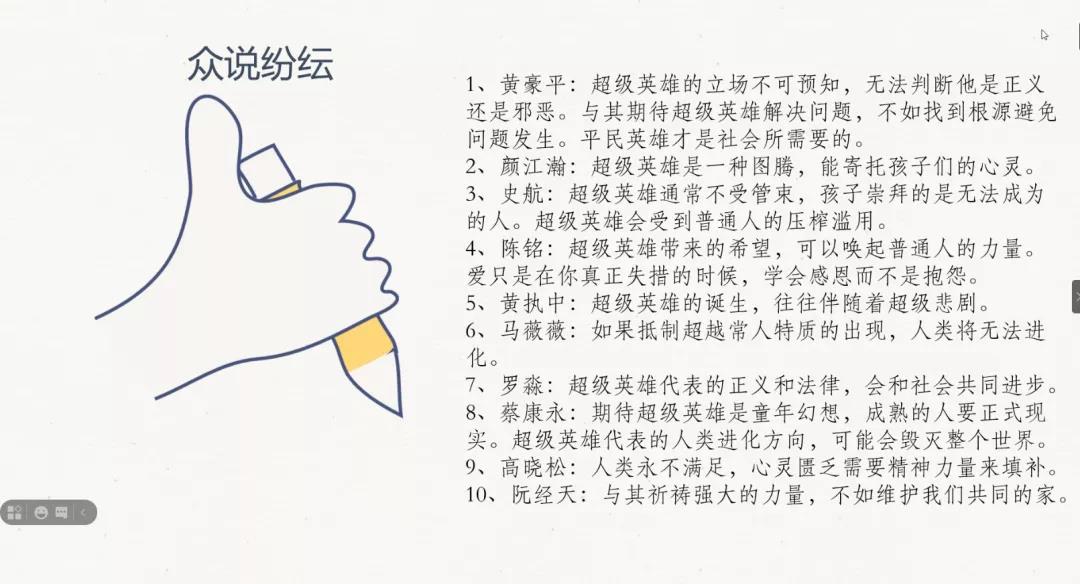 针对“世界是否需要超级英雄”这一辩题,薛杰匀同学首先明确提出自己的观点:世界并不需要超级英雄。