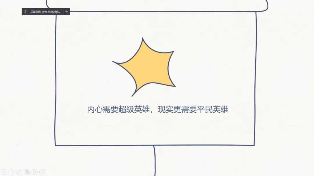 王新妍同学从《奇葩说》的观点入手,通过“人类进化”、“立场”、“希望”三个关键词引出自己对于“世界是否需要超级英雄”这一辩题的看法:我们羡慕超级英雄的能力,但又不可避免的对比自己强大的事物产生恐惧;我们依赖超级英雄的能力,而一旦超级英雄无法达到自己的期望,我们就会抛弃英雄。