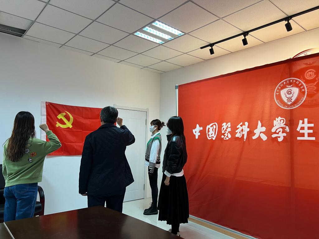 生命科学学院临时党支部成立仪式上,陈誉华向大家宣读了学院党委的决定,强调了临时党支部的意义,并带领大家重温入党誓词。4名党员面对党旗庄严宣誓,用铿锵誓言向组织表达了坚决打赢疫情防控阻击战的信心。