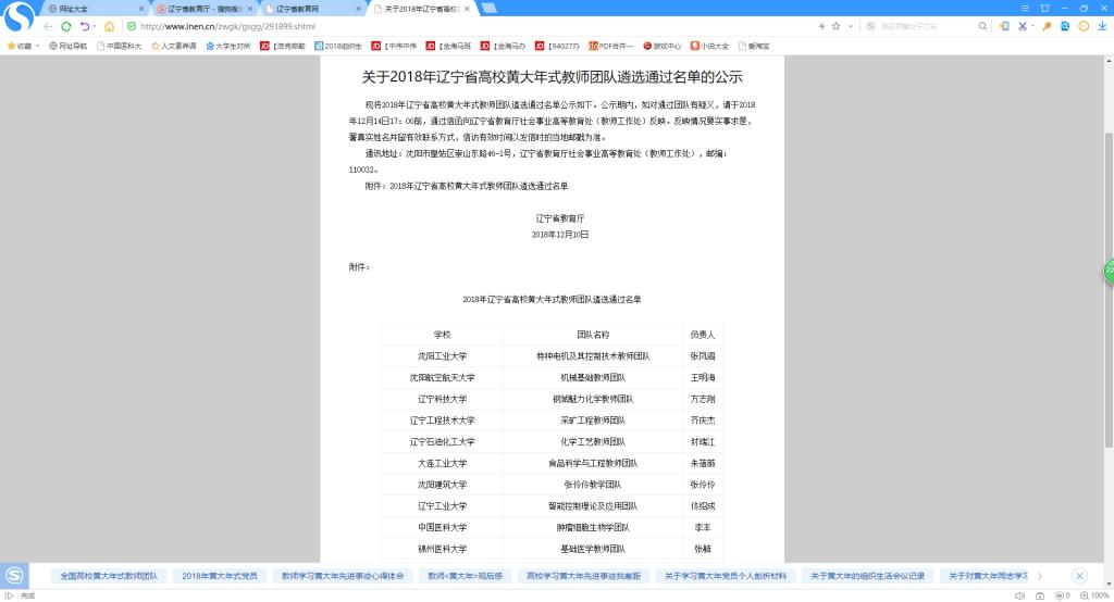 肿瘤细胞生物学团队(负责人:李丰)获得2018年辽宁省高校黄大年式教学团队
